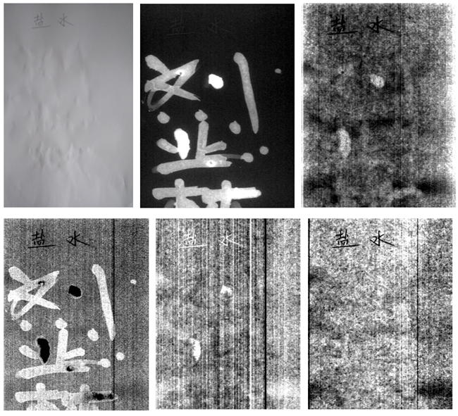 图5列举了眼液隐形字原图(手机拍摄)、MNF变换前5个成分。从原图中依然无法看到隐形字迹,但经过MNF变换后,第1成分能较好地识别出隐形字迹,第2、3、4、5以及往后的成分均无法识别眼液书写的字迹。