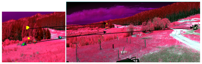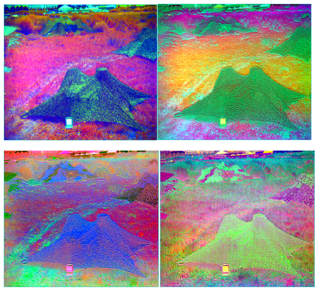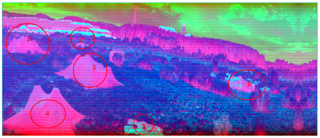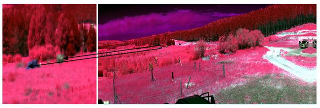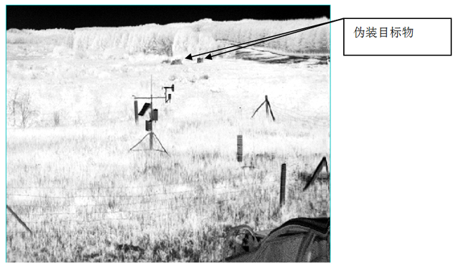 在图4和图5所示的是对原始数据进行数据处理后的影像,同样能够区分开目标对象与背景的影像,伪装网如图中所示标注的位置。
