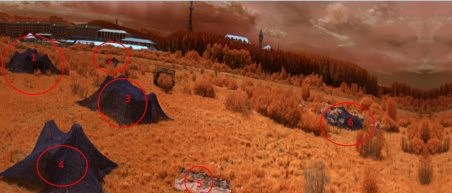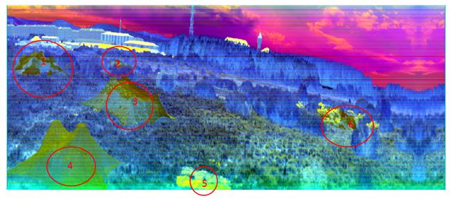 利用短波红外相机对目标进行拍摄,获取到相应的伪装目标图像,如下图所示,光谱范围为1000nm-2500nm波段。红圈标注目标为伪装网。利用短波红外波段的相机可以很直接的获取到伪装目标的影像并与其它背景目标区分开。