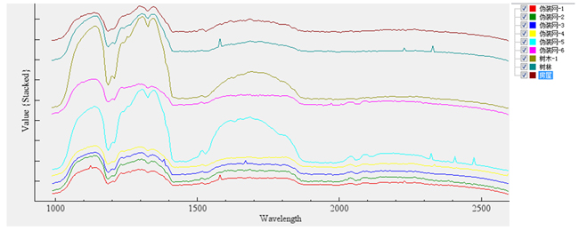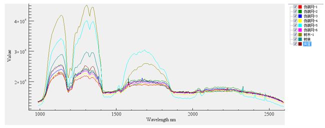 选取图像中9个目标物,分别为伪装网1-6、树木、树林、房屋为对象,获取其相应的光谱曲线,如图所示。