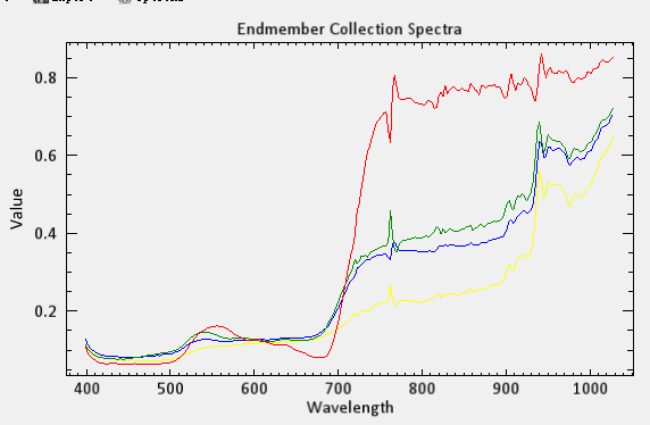 选取不同的目标对象,获取相应的光谱,植被的光谱在680nm以后分反射率会提高,而非植被所表现出来的红边效应与真实的植被的红边效应有很大的差别。