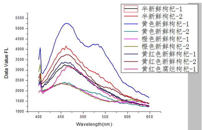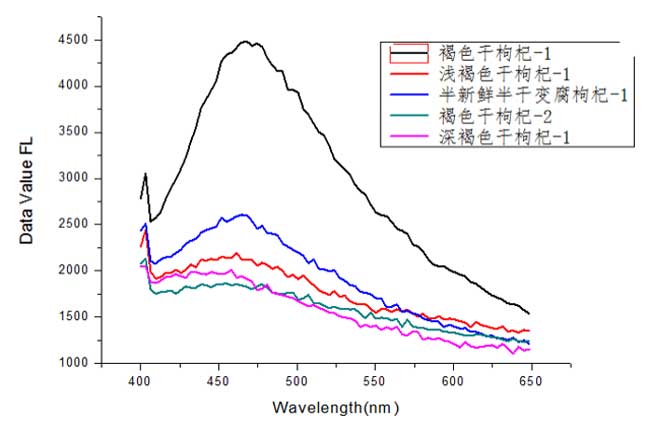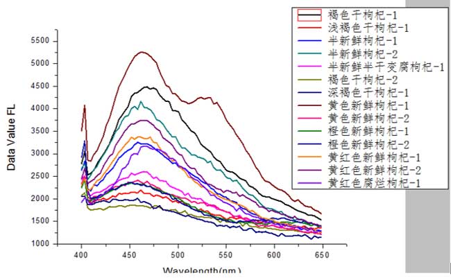 1、干枸杞荧光信号也分布在455nm附近,与新鲜枸杞比较,在550nm附近没有波峰,而且整个光谱都随着新鲜的程度其光谱曲线逐渐下降;