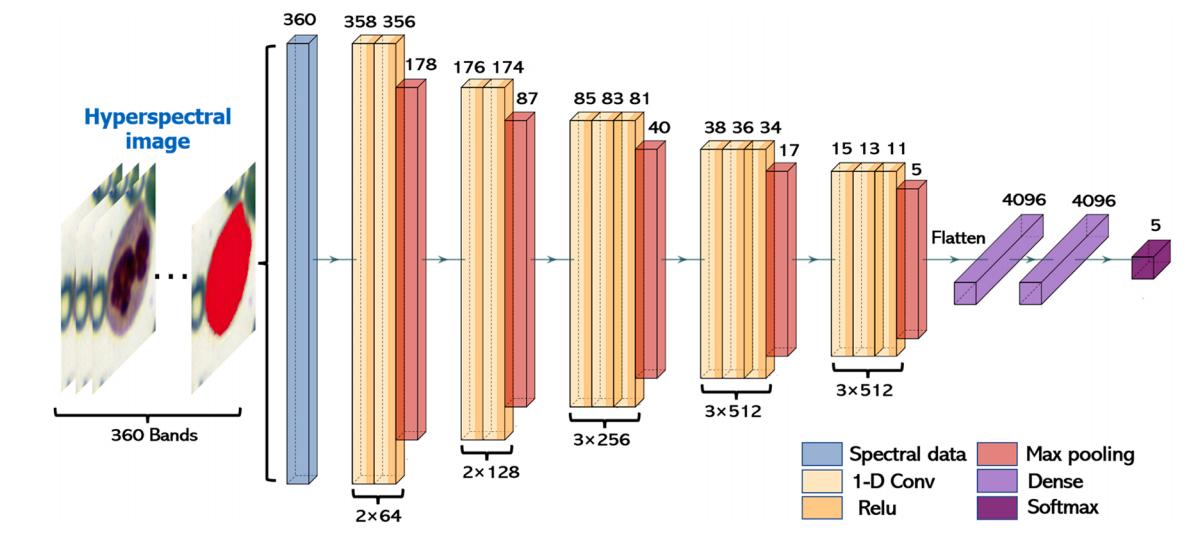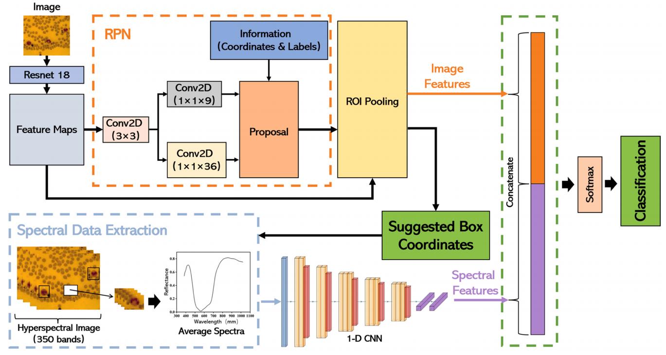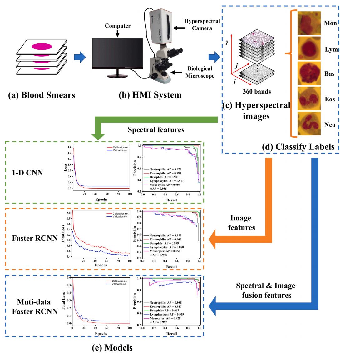 具体研究内容如下:(1)利用高光谱显微成像(Hyperspectral microscopic imaging, HMI)系统获取血液涂片中含有白细胞区域的影像,并对每种类型的白细胞进行标记,形成五种分类的数据集。(2)根据VGG16网络架构构建一维CNN网络,并基于WBC的光谱数据进行相应的训练和预测,验证光谱数据作为WBC分类依据的可行性。(3)与一维CNN相似,采用Faster RCNN作为对照组,基于伪彩色图像对WBC进行识别分类,观察基于单一数据的分类准确率。(4)最后,构建了基于图像和光谱特征的多数据Faster RCNN深度学习模型,并探讨多数据联合在白细胞检测中的可行性和优势。