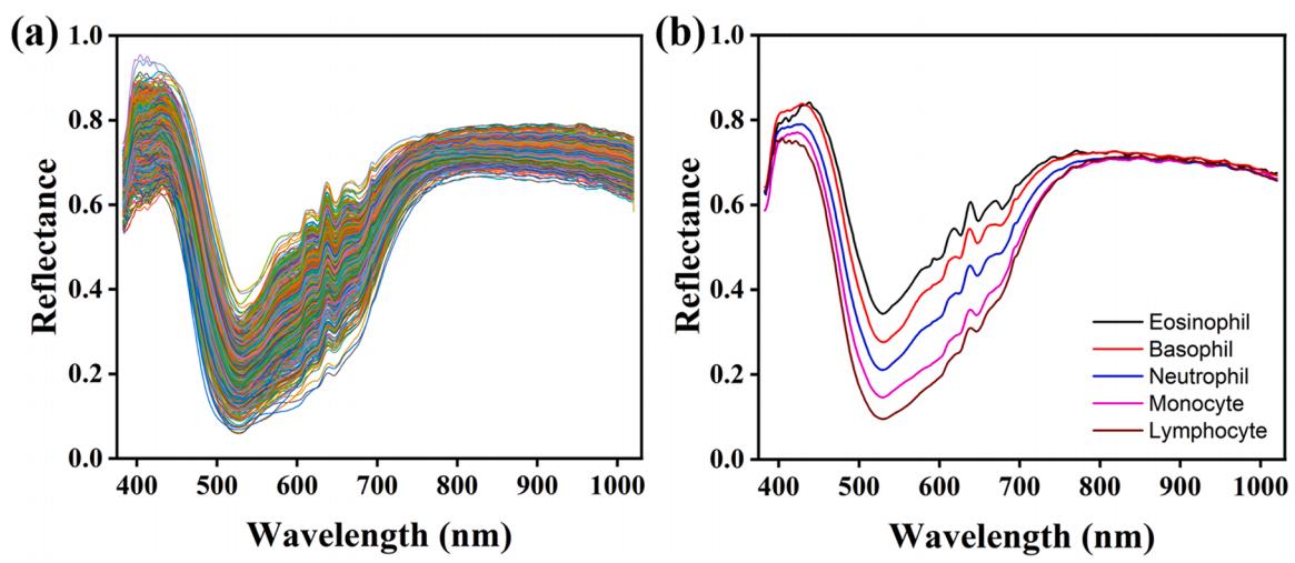 图5所有WBC(a)和五种WBC(b)的平均光谱反射率曲线
