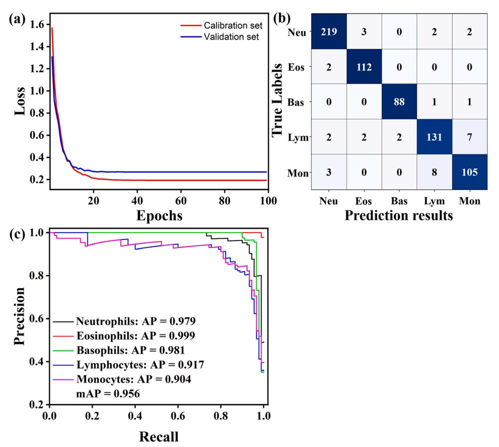 图11详细展示了多数据Faster RCNN的分类结果。当迭代次数达到40次时,校准集和验证集的总损失值分别下降0.008和0.03,然后趋于稳定,证明模型训练效果良好。与前两种模型相比,Lym或Mon的分类精度有所提高。此外,各类别之间的混淆较少,表明该模型的预测能力得到了提高。从图11c和表1可以看出,Lym和Mon的AP值改善最为明显,分别达到0.917和0.911。融合特征的分类不仅减少了白细胞之间的误判,而且有效地减少了背景与白细胞目标之间的误判。证明了多数据联合检测相对于单一数据检测的可行性和优势。