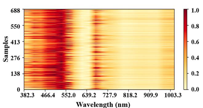 多数据Faster RCNN在预测集中得到的CAM图如图12所示。与单一数据一维CNN聚焦的400 ~ 570 nm和640 ~ 700 nm波段范围相比,多数据Faster RCNN模型在融合特征的指导下,聚焦的波段范围分别为380 ~ 570 nm和640 ~ 950 nm。同时,与单一数据Faster RCNN相比,背景的注意区域明显变窄,暗红色区域更集中在核区。这表明该模型更关注细胞的各种特征,而不是背景,有利于在复杂情况下准确检测白细胞,提高模型的泛化能力。