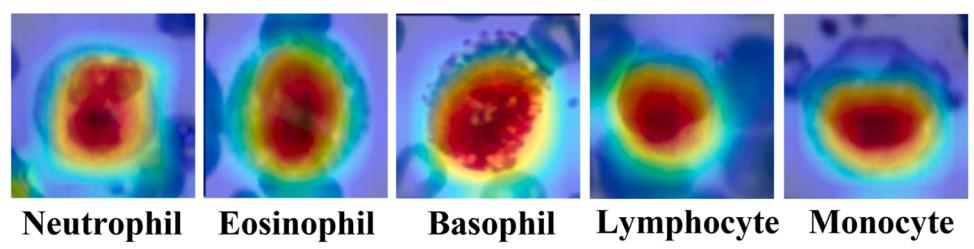 图8显示了基于Faster RCNN的5种WBC类别在两种不同图像下的检测结果。图9展示了Faster RCNN模型的具体分类结果。从模型训练的角度来看,总损失在20次迭代之前迅速下降,80次迭代之后趋于平缓,基本收敛,这证明了Faster RCNN在本WBC图像数据集中是可行的。与一维CNN相比,Faster RCNN不仅在训练过程中收敛速度更慢,而且在Neu和Eos中的分类准确率也要低得多。然而,由于Lym的形态特征与Neu和Eos有很大的不同,因此不会与这两者混淆。