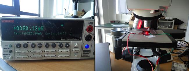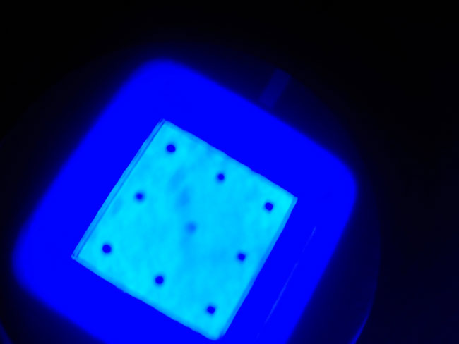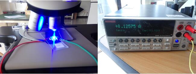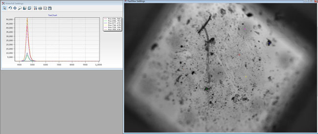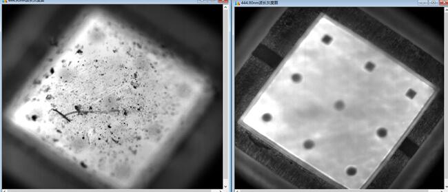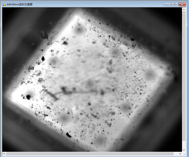 利用显微高光谱系统在10X倍的物镜下能够观察到LED光源上的微观构造,并且能够准确的测试到不同led光源对应的特征波长,而且图像也非常的清晰(实际测试时样品并非完全平整),通过焦距调试,能够凸显出光源自身的一些特征信息。