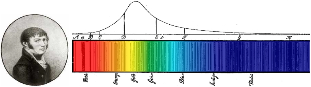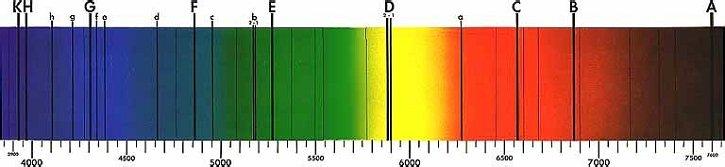 图2.夫琅禾费暗线:太阳表层元素和地球大气的吸收,到达地表的太阳光谱存在许多波段宽度为0.1~10 nm的暗线