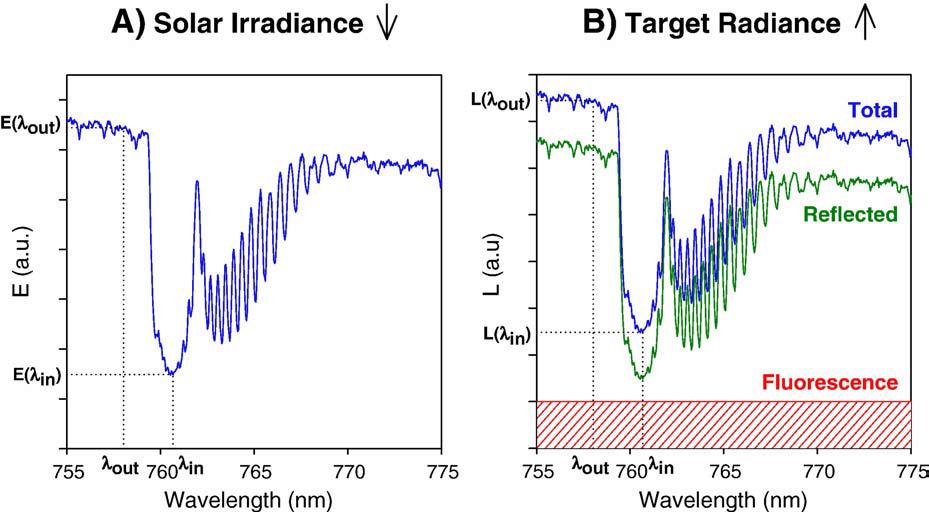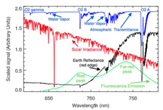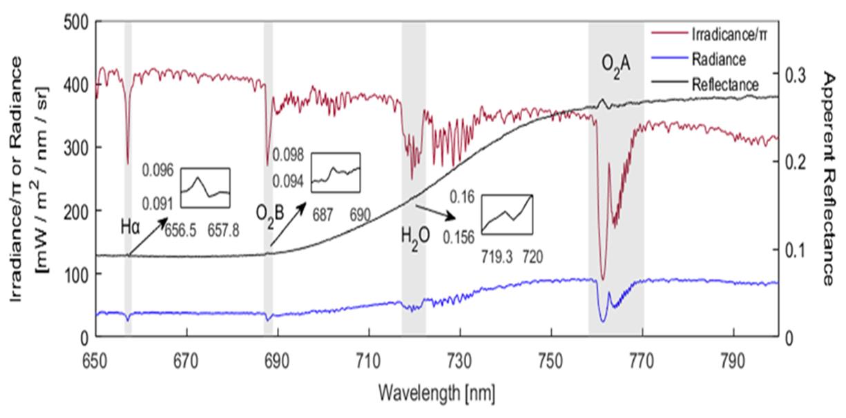 叶绿素荧光反射光谱的波段常与太阳辐射在红光和近红外的3个主要的吸收波段(即656.3nm处的太阳大气的氢吸收线,687和760nm波段处的地球大气层氧吸收线)相互重叠。687nm和760nm附近的氧气吸收线形成的夫琅禾费暗线较明显,荧光强度高。大气中的氧分子在760nm波段附近形成了暗线,在687nm 波段附近形成了暗线,而760nm波段附近的暗线深度和宽度都要大于687nm波段附近的暗线,因此760nm波段被是用来探测荧光的较好的波段。