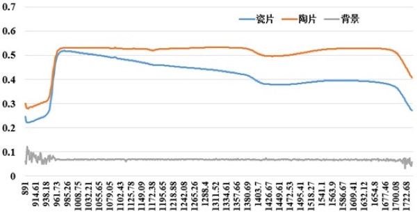 图3对比124个陶片和瓷片的平均光谱数据和背景数据。从图中能够看出,背景的光谱反射率非常低且平稳,反射率几乎在0.1以下,前后噪音过重,没有波峰波谷的存在,说明背景区域对光的反射较少,光谱特性与陶片和瓷片有明显差异。瓷片与陶片均在大约950 nm之前,反射率有较大的上升,然后在大部分波长段保持相对平稳。在整个波长范围内,瓷片的反射率明显低于陶片,尤其是在波长1000 nm之后,瓷片和陶片的反射率差异逐渐加大,这一部分的差异可以作为分类的依据。另外,两者的曲线形状在总体趋势上有相似性,但反射率水平的显著不同可能表明材料成分或结构的差异。