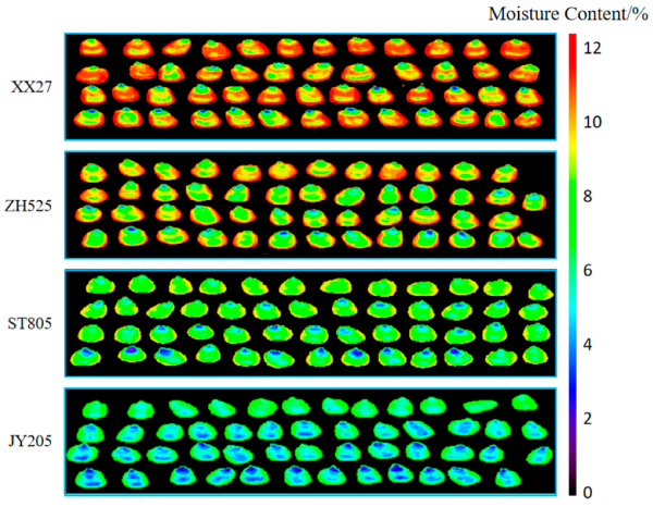 粮食水分含量在粮食收购、储藏等过程中具有十分重要的意义。粮食水分过高,不易保管,容易发热霉变,会使粮食品质发生变化,适量的水分可保证产品品质,以及粮食加工和食品制作的顺利进行。提出了一种基于高光谱成像技术的玉米种子水分含量快速无损预测方法。Xue et al. (2024)研究以80个不同品种的玉米种子为样本,利用1100–2498 nm波段的高光谱数据,结合七种预处理方法(如移动平均、S-G平滑、归一化等)优化光谱信息,并通过SPA、CARS和UVE算法分别提取17、24和39个特征波长以降低数据冗余。对比PLSR、PCR和SVM等12种模型发现,归一化-SPA-PLSR模型表现*优,其校准集和预测集的判定系数(Rc2=0.9917,Rp2=0.9914)及误差(RMSEP=0.0343,RMSECV=0.0257)均显著优于其他模型,验证了其在水分预测中的高精度与稳定性。此外,研究通过伪彩色图像实现了水分含量的空间分布可视化,为玉米种子储存、加工中的质量控制提供了高*无损检测技术支撑(图1)。