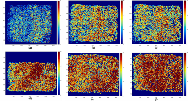 图2 大米水分含量可视化图。(a)12-13 g/100 g含水量(B)13-14 g/100 g含水量(c)14-15 g/100 g含水量(d)15-16 g/100 g含水量(e)16-17 g/100 g含水量(f)17-18 g/100 g含水量。