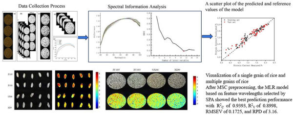 Xuan et al. (2024) 利用高光谱成像技术(400-1000 nm)结合化学计量学方法,开发了一种非破坏性稻米蛋白质含量预测模型。通过凯氏定氮法测定四个品种稻米样本的蛋白质参考值,并对光谱数据进行乘性散射校正(MSC)等预处理,结合连续投影算法(SPA)筛选特征波长。研究发现,基于MSC-SPA-多元线性回归(MLR)的模型表现*优,校准集和验证集的决定系数分别为0.9393和0.8998,验证集均方根误差(RMSEV)为0.1725,相对分析误差(RPD)达3.16。此外,通过像素级映射实现了稻米蛋白质分布的可视化,揭示了不同品种间蛋白质含量的差异(如XD9含量最低,JF105和JF103较高)。研究过程如图5所示。