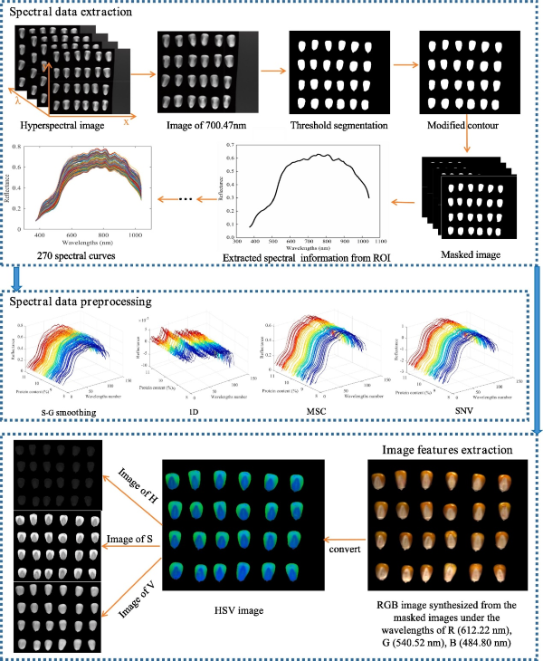 Qiao et al. (2024)通过整合高光谱成像的光谱与图像特征,实现了玉米籽粒中蛋白质和淀粉含量的快速无损定量测定。研究利用可见光-近红外(400-1005.80 nm)高光谱数据,结合颜色特征(H、S、V通道的低阶矩)和纹理特征(对比度、相关性等),构建了40种预测模型。通过对比不同预处理方法(S-G平滑、MSC、SNV)和建模算法(PLSR、SVR、ELM),发现极*学习机(ELM)结合标准正态变换(SNV)和乘性散射校正(MSC)预处理效果*佳。进一步利用连续投影算法(SPA)和无信息变量消*(UVE)筛选特征波长,并与图像特征融合后,蛋白质和淀粉的*优模型分别为SNV-SPA-Color-ELM(验证集R²=0.9228,RMSEp=0.2771%)和MSC-UVE-Texture-ELM(验证集R²=0.8847,RMSEp=1.1221%),其相对分析误差(RPD)分别达2.60和2.38,表明模型具备高精度与强鲁棒性。研究创新性地在未干燥样本条件下通过特征融合克服水分干扰,为玉米品质田间实时监测及工业分选提供了高*无损检测方案。研究过程如图6所示。