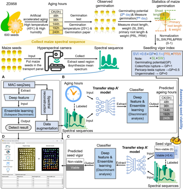Zhu et al. (2025) 提出了一种基于多头注意力卷积序列到序列模型(MAC-seq2seq)的玉米种子活力检测方法,通过光谱重建与深度特征提取结合集成学习模型,实现了种子老化时间和活力的高*分类。实验表明,MAC-seq2seq在400-1000 nm光谱范围内重建误差(RMSE)低至2.818×10⁻⁶,结合子空间判别模型对老化时间(48-240小时)和活力(基于种子活力指数SVI≥0.4)的检测准确率分别达93.33%和97.62%。研究进一步构建了集成光谱分析与可视化功能的在线检测平台,通过Shapley值解析了光谱特征贡献,发现叶绿素(434/642/662 nm)和脂肪酸C-H振动(930-990 nm)等波段对活力预测具有显著影响。该方法为小样本场景下玉米种子活力的无损评估提供了高精度解决方案,尤其适用于复杂存储条件下的种子质量监测。研究过程如图7所示。