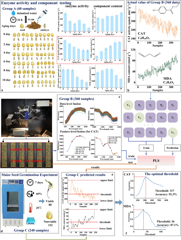 An et al. (2024)通过结合高光谱成像技术与数据融合策略,开发了一种绿色无损的单粒玉米种子活力评估方法。研究以过氧化氢酶(CAT)活性和丙二醛(MDA)含量为关键生化指标,基于人工老化实验构建了不同老化梯度的种子样本,并利用偏最小二乘回归(PLSR)模型预测CAT和MDA含量,结合低层与中层数据融合策略优化模型性能(预测集RPD分别为2.11和2.93)。进一步提出双阈值判别策略,通过设定CAT活性(阈值317 μmol·min⁻¹·g⁻¹)和MDA含量(阈值22 nmol·g⁻¹)的联合阈值,实现了种子活力的高*分类,准确率达92.9%。该方法通过生化指标与光谱特征的关联性,为种子活力评估提供了可解释的定量依据,相比传统发芽试验和单一光谱模型,兼具高*性、环保性和高精度,为农业种子质量管理提供了新思路。研究过程如图7所示。