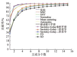 图3 不同光谱预处理的前15个主成分累计贡献率
