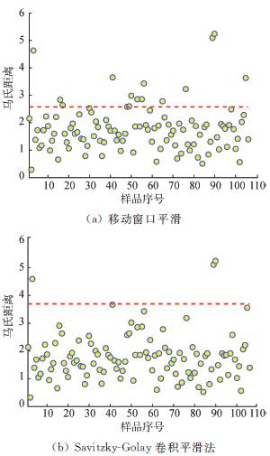 随后采用SG卷积平滑法与移动窗口平滑法这两种光谱预处理方法的前4个主成分对马氏距离进行计算。其中SG卷积平滑法剔除3个异常样本(最佳阈值为2.2),移动窗口平滑法剔除15个异常样本(最佳阈值为0.9),如图4所示。