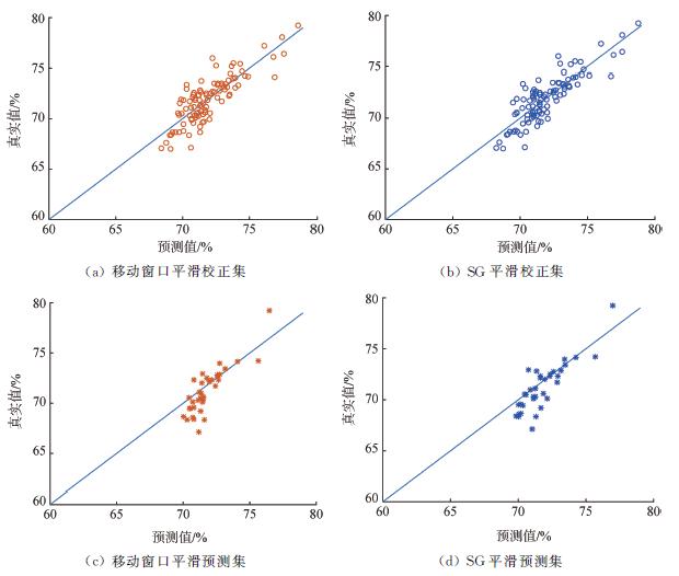 图5 移动窗口平滑和Savitzky—Golay卷积平滑的预测值和真实值之间的关系