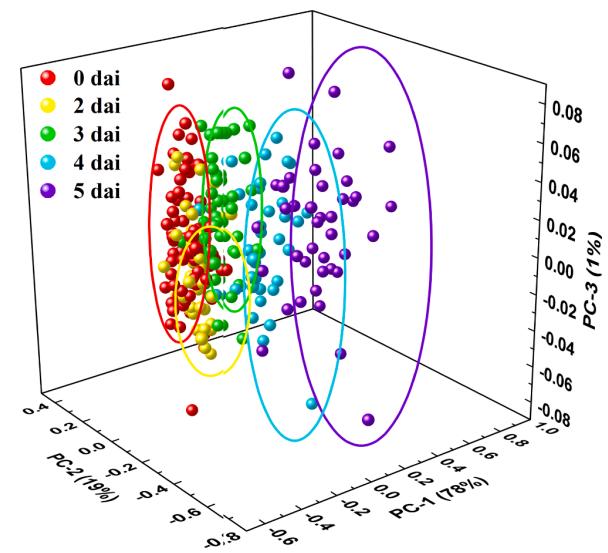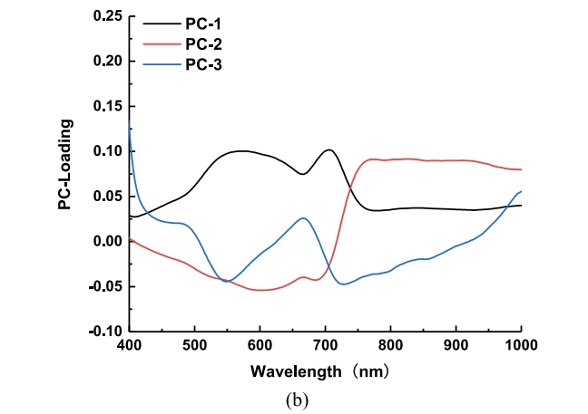 获取小麦白粉病高光谱时序响应特征(图2)。随后利用主成分分析(PCA)观察不同感染阶段样本间的区分能力,观测分析了不同染病阶段样本的分类散点图(图3)、主成分特征图像与载荷曲线(图4)
