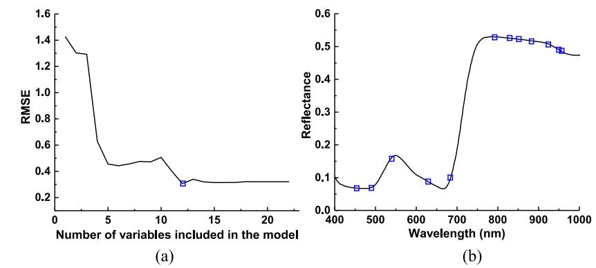 图5显示利用连续投影算法(SPA)进行特征波长选择的过程。当RMSE达到最小值0.31时,确定了12个特征波长,分别是457,491,540,634,677,790,831,857,888,933,952,967nm。最终以光谱数据建立PLS-DA模型得到校正和交叉验证的总分类准确率分别为93.8%和89.2%,在验证集的预测中,总分类准确率为88.6%。利用灰度共生矩阵(GLCM)从前3张PC得分图像中提取3种纹理特征(能量、熵和对比度),生成9个纹理变量。由纹理特征建立PLS-DA模型,最终得到校准、交叉验证和验证中总分类准确率分别为74.6%、73.8%和70.0%。