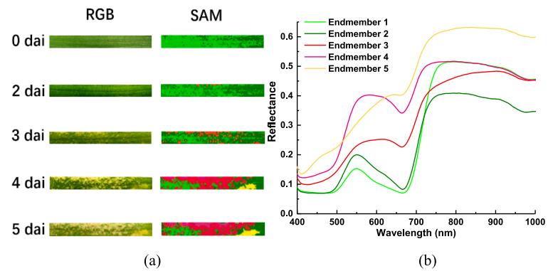 将高光谱图像的光谱和纹理特征融合,建立PLS-DA模型。融合数据每个样本产生21个变量,包括12个特征波长和9个纹理特征。校正和交叉验证的总分类精度分别为97.7%和93.8%,在验证集的预测中,总分类准确率高达91.4%。此外,借助光谱角映射(SAM)方法进行不同染病阶段的病斑识别,实现了小麦白粉病发病过程可视化监测(图7)。
