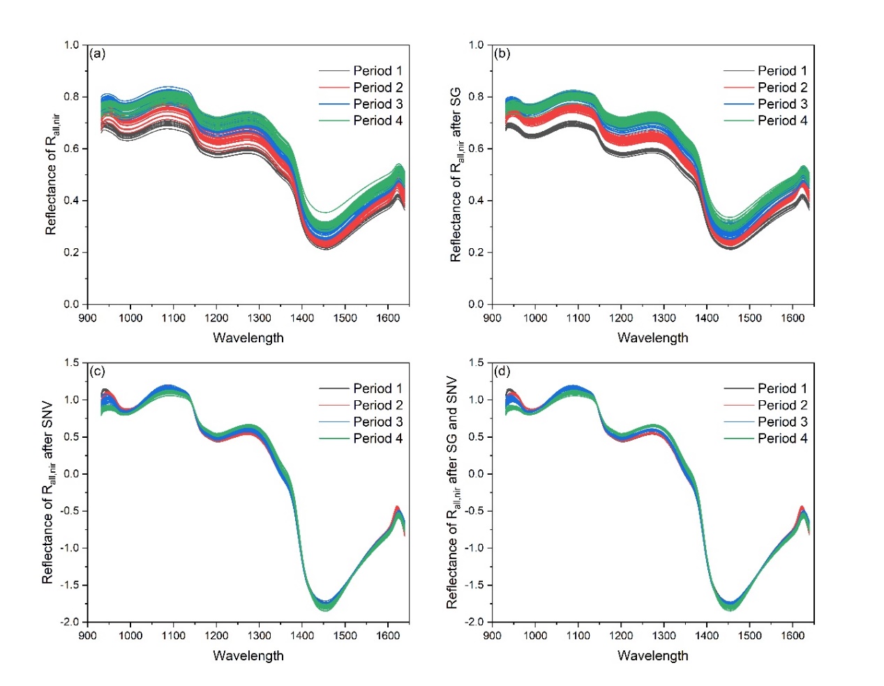 图3 近红外子实体整体的反射率经过3种预处理的结果。(a)原始光谱,(b)SG平滑,(c)SNV,(d)先SG平滑后SNV。