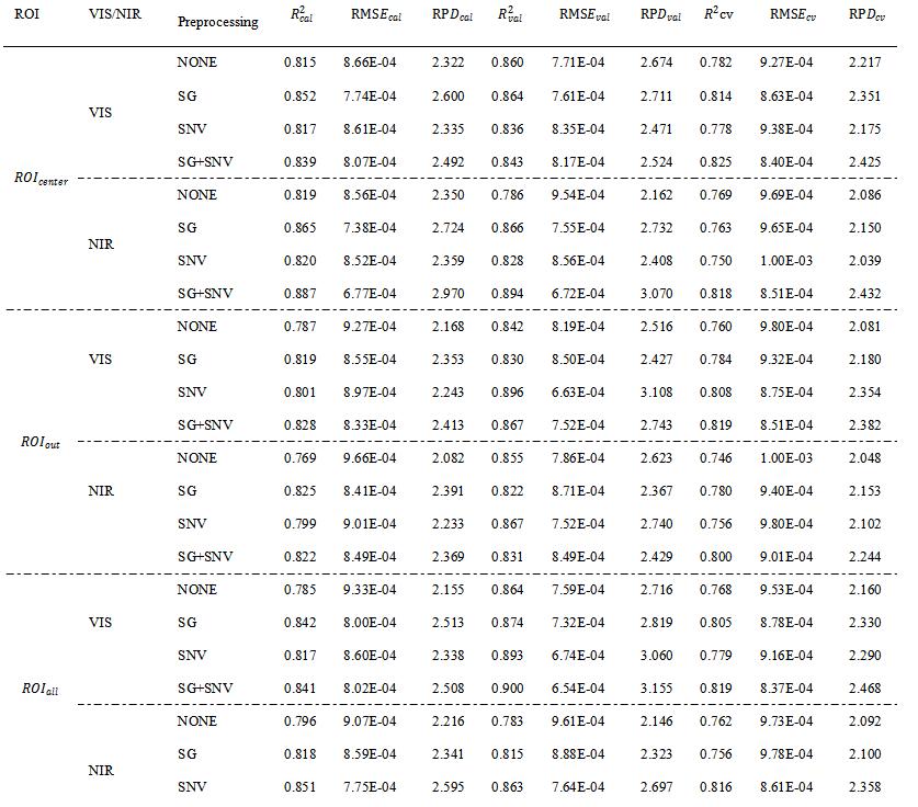 针对不同ROI、不同光谱范围和不同的光谱预处理方法得到的光谱数据进行建模,最终结果如表1所示。