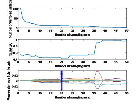 建立了二分类模型(区分纯铁观音和掺假铁观音)和六分类模型(区分纯铁观音和五个掺假等级的茶叶)。在确定模型的预处理(SG)方法后,选择特征波长对模型进行简化。在SG平滑后,应用了四种特征选择方法。SG平滑结合SPA、CARS、RF和UVE算法,将104个通道分别减少到33、11、44和46个通道。图4显示了SG-CARS之后的特征选择。SG7平滑结合四种特征波长选择方法的评价指标如表2所示。所有的特征选择方法都有助于降低数据维数。