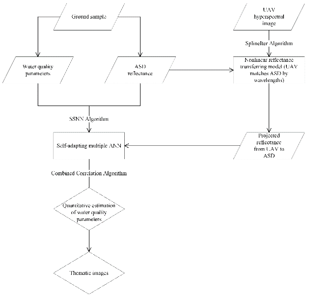 图1显示了用于估计水质参数的方法。首先,地面样本包含ASD反射率数据和水质参数两部分,用于建立SSNN模型。其次,利用非线性反射率传递模型中的UAV高光谱图像数据作为输入,通过将UAV的反射率传递到ASD来细化数据。第三,传递的UAV反射率数据被用于SSNN模型,从而对水质参数进行定量估计,并利用ArcGIS软件包生成专题图。