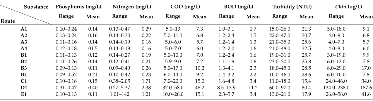 表1展示了不同路线的水质参数。D1的浑浊度、Chla、BOD、COD和氮在各样地中最高,因为水样采集于养鱼池。有机物导致高浓度的BOD、COD和氮。由于缺乏良好的出水口和进水口,水池浊度高度集中,造成水池浊度迅速增加。其他路线的水质参数浓度较低,这是因为存在水交换,生活废物较少。
