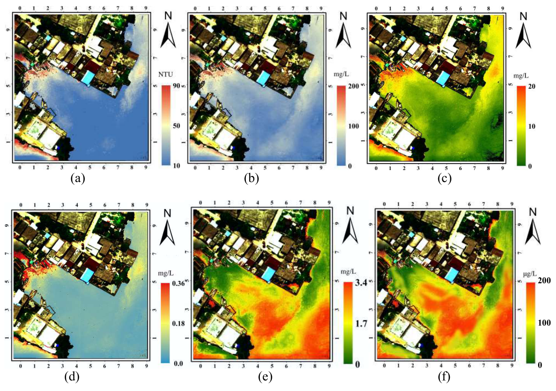 表3列出了不同方法在整个区域测试集上的性能,包括SSNN、传统单层神经网络和Liew等人的经验方法。本研究所提出方法在RMSE和MPAE方面优于其他方法。SSNN对氮的估算效果最佳(MPAE最低)。MPAE比RMSE更有说服力,因为它有效地证明了所提出方法的数值预测的准确性。后期需要在整个区域内收集更多的数据,以确保对各项水质参数进行准确的数值预测。氮的R2值比其他的R2值大,而一些R2值高的水质参数由于随机样本量小,其MPAE可能并不低。本研究所提出的方法对大多数水质参数的预测是正确的,尽管样本没有覆盖整个区域上所有间隔40厘米的像素点。