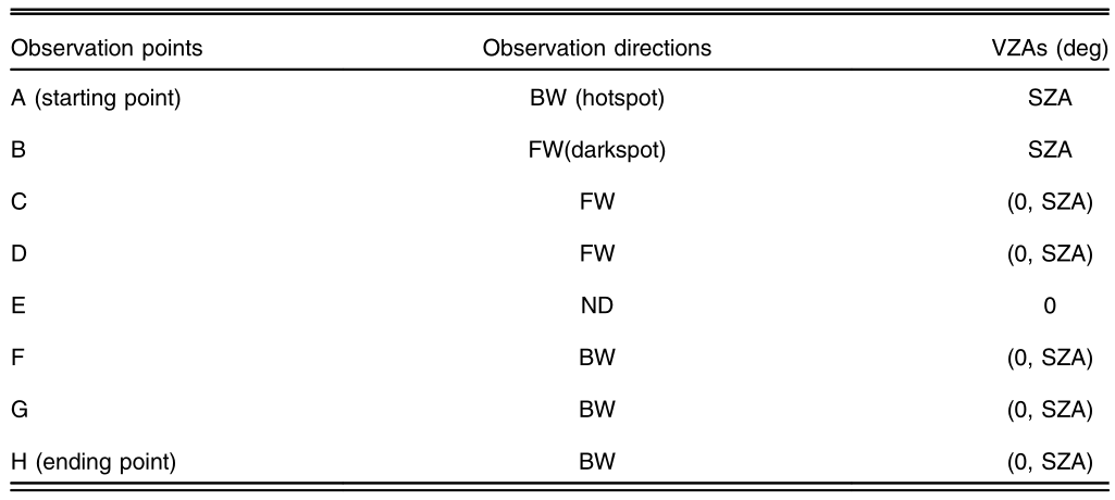 表2 多角度观测飞行规范。BW、FW和ND分别表示后向、前向和垂直点观测值。