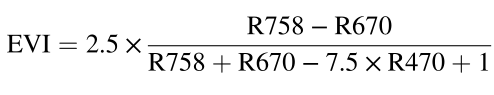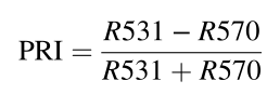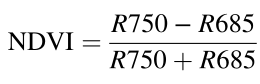 对UAV平台收集的数据进行预处理,包括大气校正、辐射校准和几何校正。然后计算光谱指数,包括NDVI,EVI和PRI,计算公式如下所示。