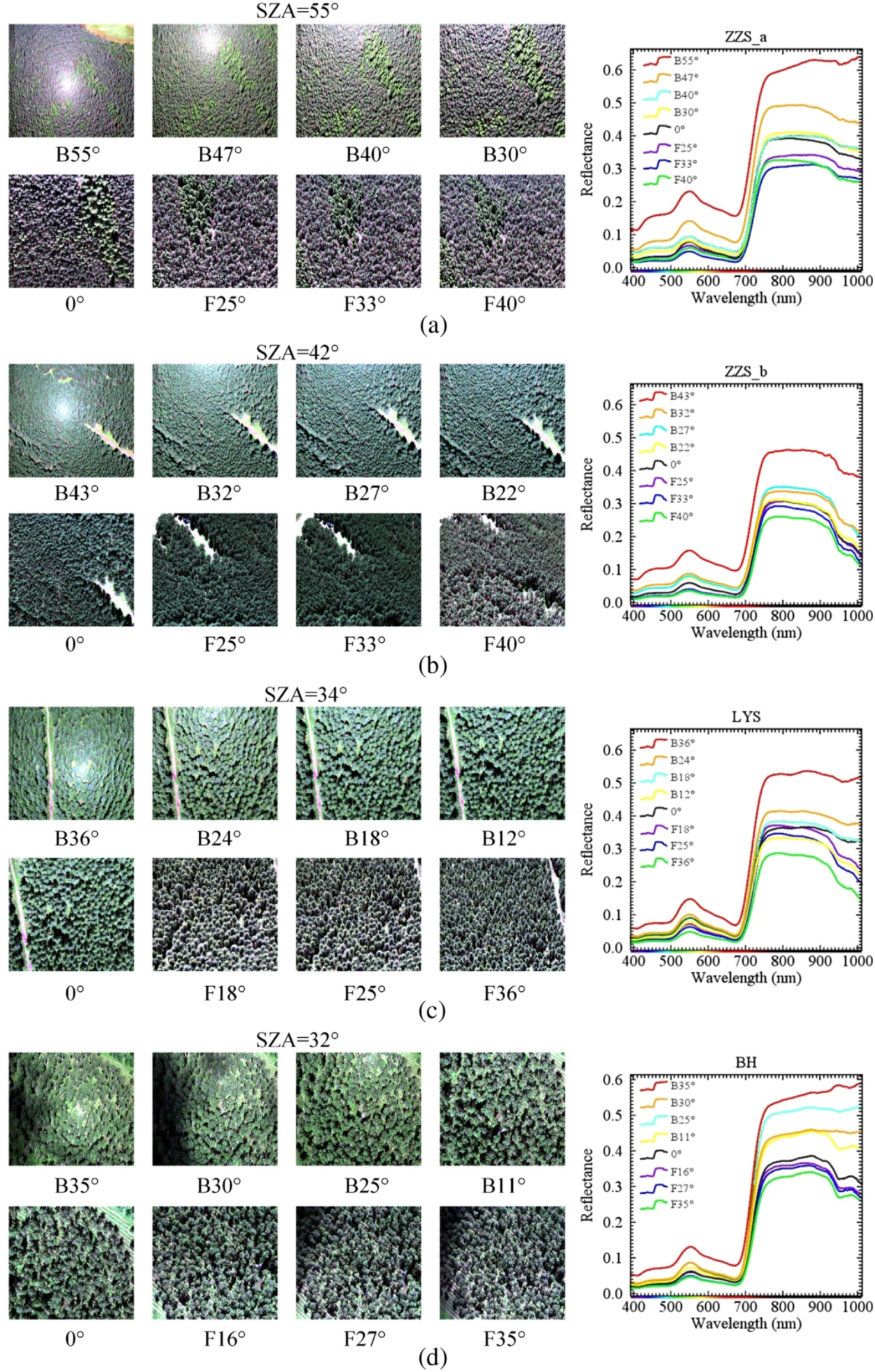 在VZA相同的情况下,从后向视角拍摄的照片比从前向视角拍摄的照片更亮。例如,图2a中VZA为40度(B40°)的后向照片比VZA为40度(F40°)的前向照片更亮。此外,在ZZS_a、ZZS_b、LYS、BH图中,所有后向照片都比前向照片更亮,并且存在热点照片比同一图中的其他照片看起来更均匀的现象。ZZS_a、ZZS_b、LYS、BH图的垂直点照片与前向照片差异不大。