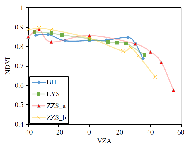图5显示了来自ZZS_a图的不同VZAs的NDVI图像。越靠近热点,NDVI值越小。相反,离热点越远,NDVI值越大。热点图像的NDVI均值在7个VZAs中最小,同时VZA不同观测方向的后向NDVI均值要小于前向NDVI均值。图6显示了不同地块NDVI随不同VZAs的变化。ZZS_a图的NDVI最大值在F33°,最小值位于热点处。ZZS_b图的NDVI最大值在F33°,最小值位于热点处。LYS图的NDVI的最大值和最小值分别在暗点和热点。与LYS图相似,BH图NDVI的最小值在热点处,与LYS图不同,BH图NDVI的最大值不在暗点处(F35°),而是在F27°。与其他三个图一样,BH图前向观测的NDVI值大于后向观测的NDVI值。