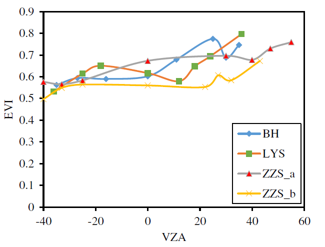 EVI作为NDVI的代理可以消除土壤背景和气溶胶的影响,增强植被信息。但EVI和NDVI在热点附近的变化趋势相反(图7),说明至少在热点方向上,EVI和NDVI可能包含不同的信息。在LYS图中,EVI从暗点到热点呈现先增大后减小再增大的趋势。与ZZS_a图和ZZS_b图一样,BH图前向观测的EVI值小于后向观测值。在图7中,前向观测的EVI值基本没有变化。与NDVI相反,无论阔叶林还是针叶林,热点区EVI值均最大。因此可以得出结论,后向观测VZAs对EVI的影响较大,而前向观测VZAs对EVI的影响较小。