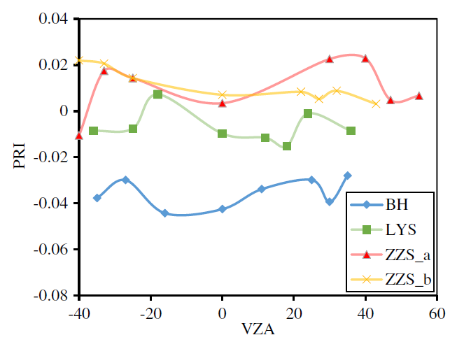PRI对叶黄素的变化非常敏感,可用于指示光合光利用速率或碳同化效率,为评估短时间内的LUE(light use efficiency)变化提供了直接方法。然而,PRI与LUE之间的关系不仅受植被冠层结构和植物生理特征的影响,还受观测几何(太阳-目标-传感器角)的影响。图8展示了不同样地PRI随VZAs的变化规律。可以看到,在不同观测方向上相同VZA下,后向PRI均值小于前向PRI均值。与ZZS_b图进行比较,ZZS_a图的PRI值在不同VZAs上有较大的波动趋势。ZZS_a和ZZS_b的PRI值高于LYS,并且BH的PRI值比ZZS_a、ZZS_b和LYS的值要低。因此,多角度数据可以通过PRI来表达森林冠层的差异。