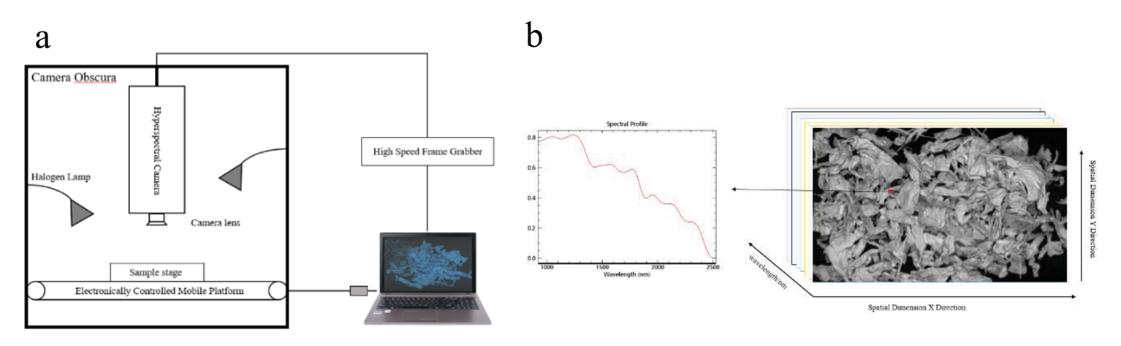图1 高光谱成像系统(a)和高光谱影像(b)