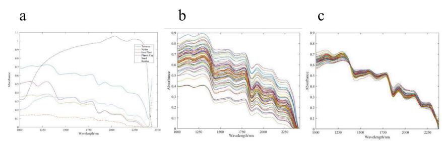 图1 烟叶与杂质的平均光谱曲线(a)、烟草叶片在MSC前的吸收曲线(b)、MSC后的吸收曲线(c)