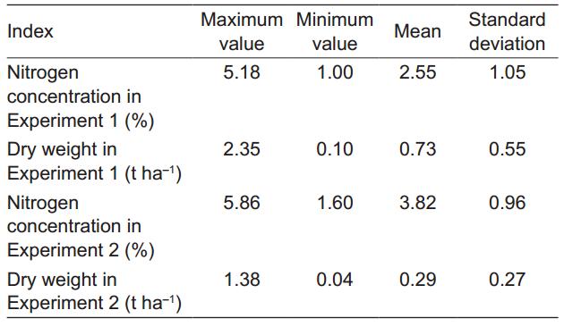 由于试验包含了整个生育期的采样数据,两组试验中植株氮浓度和地上部干重的分散程度较高,*大值和*小值差异较大。由于施氮量较高,试验1的全氮浓度和干重均高于试验2。在试验2中,由于分蘖期和拔节期取样密度较高,平均氮浓度较高,地上部平均干重较低。