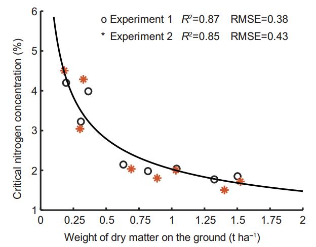 临界氮浓度是作物达到*大生物量所需的*小氮浓度,因此可以根据临界氮浓度构建缺氮方程来确定水稻缺氮情况。对各时段的临界氮浓度点进行幂函数拟合,构建作物临界氮浓度曲线:Nc (%) = a*DM-b,Nc为水稻临界氮浓度,DM为地上干重,a、b为曲线参数。由临界氮浓度曲线推导出缺氮方程:Nand (%) = Nc–Nnc,Nand为缺氮,Nnc为不同施氮量下植株的实际含氮量。