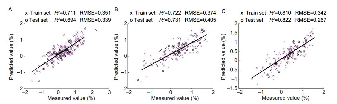 图5 基于NSGA-III-ELM的原始(A)、差值(B)、比值(C)光谱反演模型