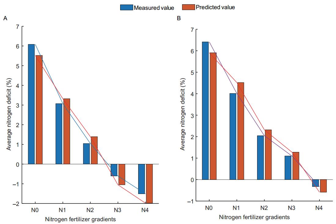 图6 试验1(A)和试验2(B)不同氮梯度下预测氮亏缺的比较