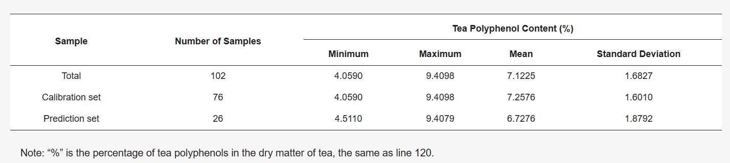 Luo, X., Xu, L.j., Huang, P., Wang, Y.c., Liu, J., Hu, Y., Wang, P., & Kang, Z.l. (2021). Nondestructive Testing Model of Tea Polyphenols Based on Hyperspectral Technology Combined with Chemometric Methods. Agriculture, 11:673-687.
