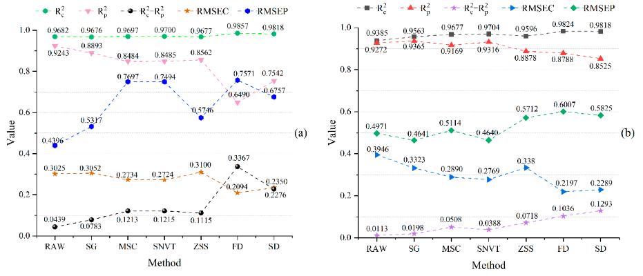 基于高光谱技术建立的模型结果受多种因素的影响。特征数据预处理方法是影响分析结果的主要因素。常见的光谱数据预处理方法包括正交信号校正(OSC)、一阶导数(FD)、二阶导数(SD)、多元散射校正(MSC)、标准正态变量变换(SNVT)、Savitzky-Gola滤波(SG)。结果表明,这些方法可以减少外界因素的影响,在一定程度上提高检测的准确性。