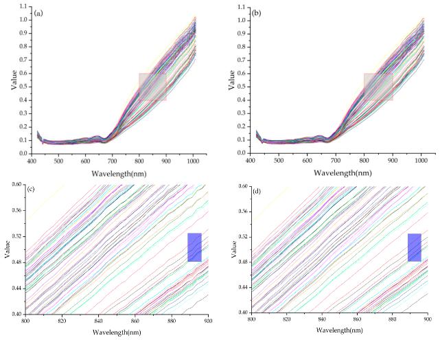 图3 藏茶光谱曲线。原始数据(a);通过SG算法预处理的数据(b);(c)图为(a)中红框的放大视图;(d)图为(b)中红框的放大视图。
