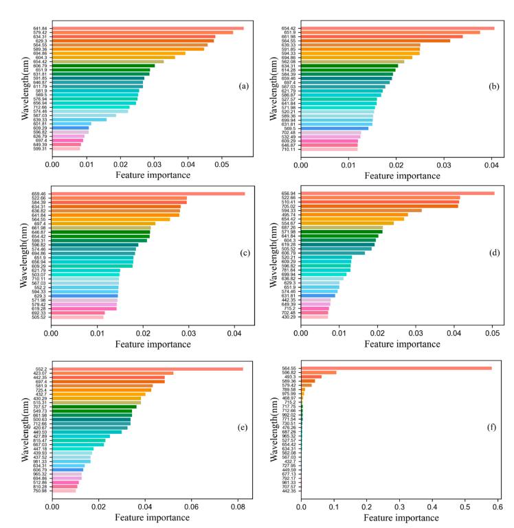 图4 由不同算法选择的特征波段。GB(a);AdaBoost(b);RF(c);CatBoost(d);LightGBM(e)和XGBoost(f)。