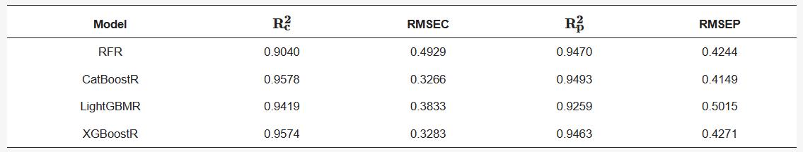 本研究以RFR、LightGBM和XGBoostR为三个基础学习模型,以CatBoostR为元学习模型,建立了一个新的stacking预测模型(图5)。表3展示了不同模型的预测结果。与全波段建模结果相比,即使特征维数降低,模型性能也没有相应降低。优选特征在一定程度上提高了建模精度,并进一步提高了模型鲁棒性。CatBoostR模型的预测精度普遍可以接受,RMSEC小于0.35,RMSEP小于0.45。CatBoost + CatBoostR模型的RMSEC和RMSEP值最接近。因此,该模型被认为是四个独立模型中*好的。本文建立的stacking模型中以CatBoost算法提取的特征作为输入的模型效果*优。图6a是CatBoost + stacking模型对藏茶茶多酚含量的预测结果。由于茶多酚含量在7%左右的样本数量较少,SPXY没有在该值附近分配测试集。因此,在SPXY划分的数据集中,选择对应于校准集中茶多酚含量为7.2671%的样品作为测试样本之一,选择对应于测试集中茶多酚含量为8.7892%的样品作为校准样本之一。如果替换的数据被输入到CatBoost + stacking模型中,校准集R2为0.9686,RMSEC为0.2833,测试集R2为0.9577,RMSEP为0.3703。